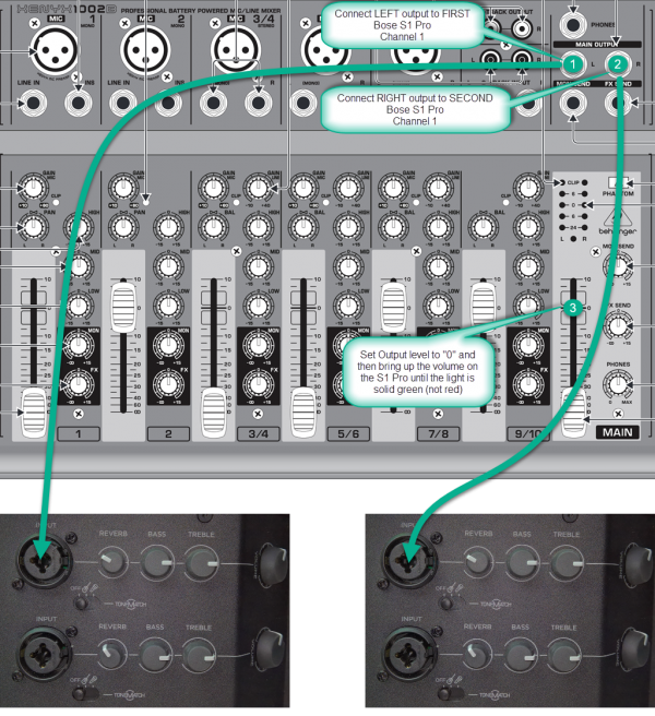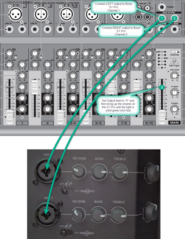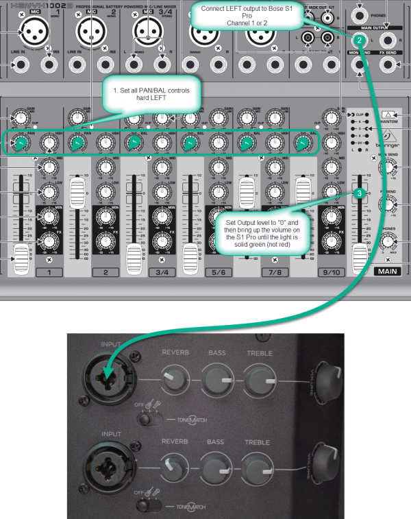 3. Set the Behringer MAIN output at "0" bring up the volume on the S1 Pro until you see solid green but not red on the channel LED.