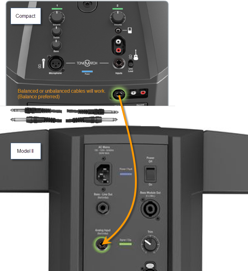 Note: The volume settings on the Compact will raise and lower the output to the Model II. Set the volumes on the Compact first and then bring up the level on the Model II Analog Input to set the relative volumes between the two systems.