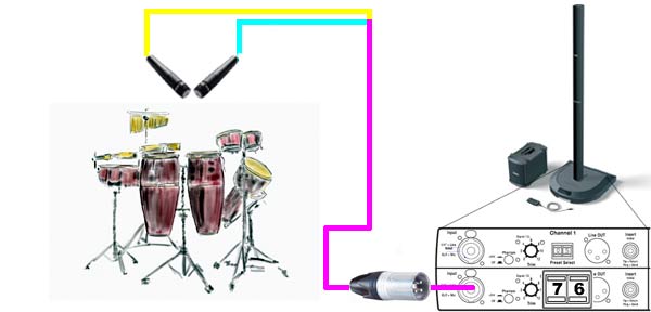 If you want to have more than two or three microphones for Drums, then you can use a mixer for a submix running to one Channel on your Power Stand. Use another Channel (1 or 2) free for the Kick Drum so you can use a Preset. Although it is not shown here, you could run the mixer to Channels 3 or 4. This would leave you with Channel open for a Vocal microphone.