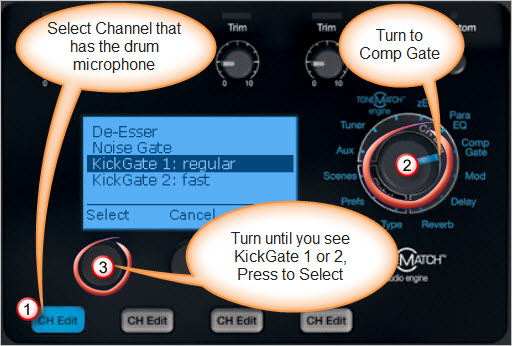 KickGate settings are available in the Comp/Gate menu on the ToneMatch Mixer[5].