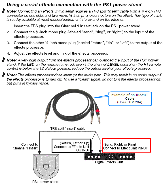 Note - you will need an INSERT cable for each Bose Channel you want to run through your effects unit. (up to 2 max).