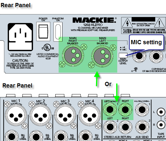 Rear panel showing XLR outputs and attenuator button, and top panel with the ¼ inch phone outputs. http://mackie.com/pdf/1202vlzpro_om.pdf