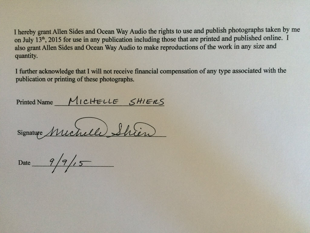 I hereby grant Allen Sides and Ocean Way Audio the rights to use and publish photographs taken by me on July 13th 2015 for use in any publication including those that are printed and published online. I also grant Allen Sides and Ocean Way Audio to make reproductions of the work in any size and quantity. I further acknowledge that I will not receive financial compensation of any kind associated with the publication or printing of these photographs. Michelle Shiers September 9, 2014
