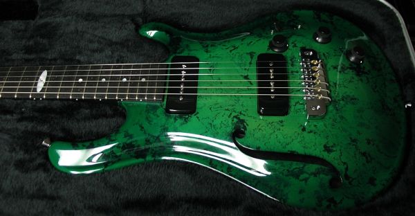 An award-winning (Premier Guitar magazine’s Premier Gear Award, and a 5 star review in their June 2009 issue) instrument of class, the Flaxwood Liekki (liekki = flame) neatly embodies the entire Flaxwood philosophy: vintage elegance with modern design. Featuring Seymour Duncan SP90 Vintage Soapbar pickups and the ultra-stable Schaller LP Tremolo, the Liekki sets a new standard for superb playability and P90 tone.