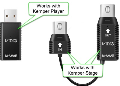 The XSONIC Airstep finds the M-VAVE 5-Pin MIDI connectors automatically (right side of the photo) and these work with the Kemper Stage and Kemper Profilers (Head and Rack versions)