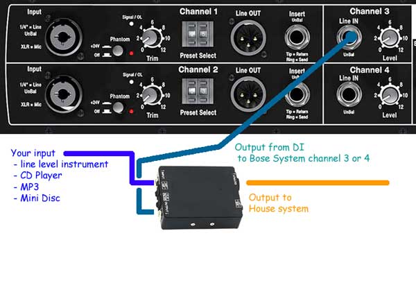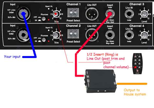 For Channels One or Two insert a 1/4 inch cable halfway into the Insert jack to get a signal that is controlled by the volume control on the Remote. This is also known as the Half Insert method. For more information about 1/4 cables see Tip Ring Sleeve connections. The rectangular box shown below the input panel is a DI, used to output the signal to a console or house system.