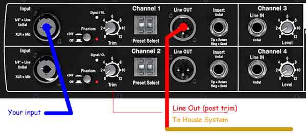 For Channels One or Two you can run an XLR cable to the House or recording console like this. The outputs are post-trim (+4 dBu nominal).
