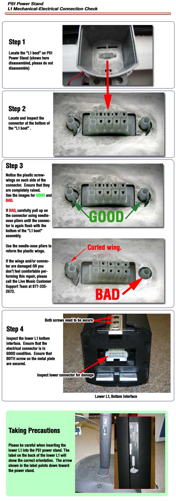 Inspecting for damaged connectors in the PS1 Powerstand boot.