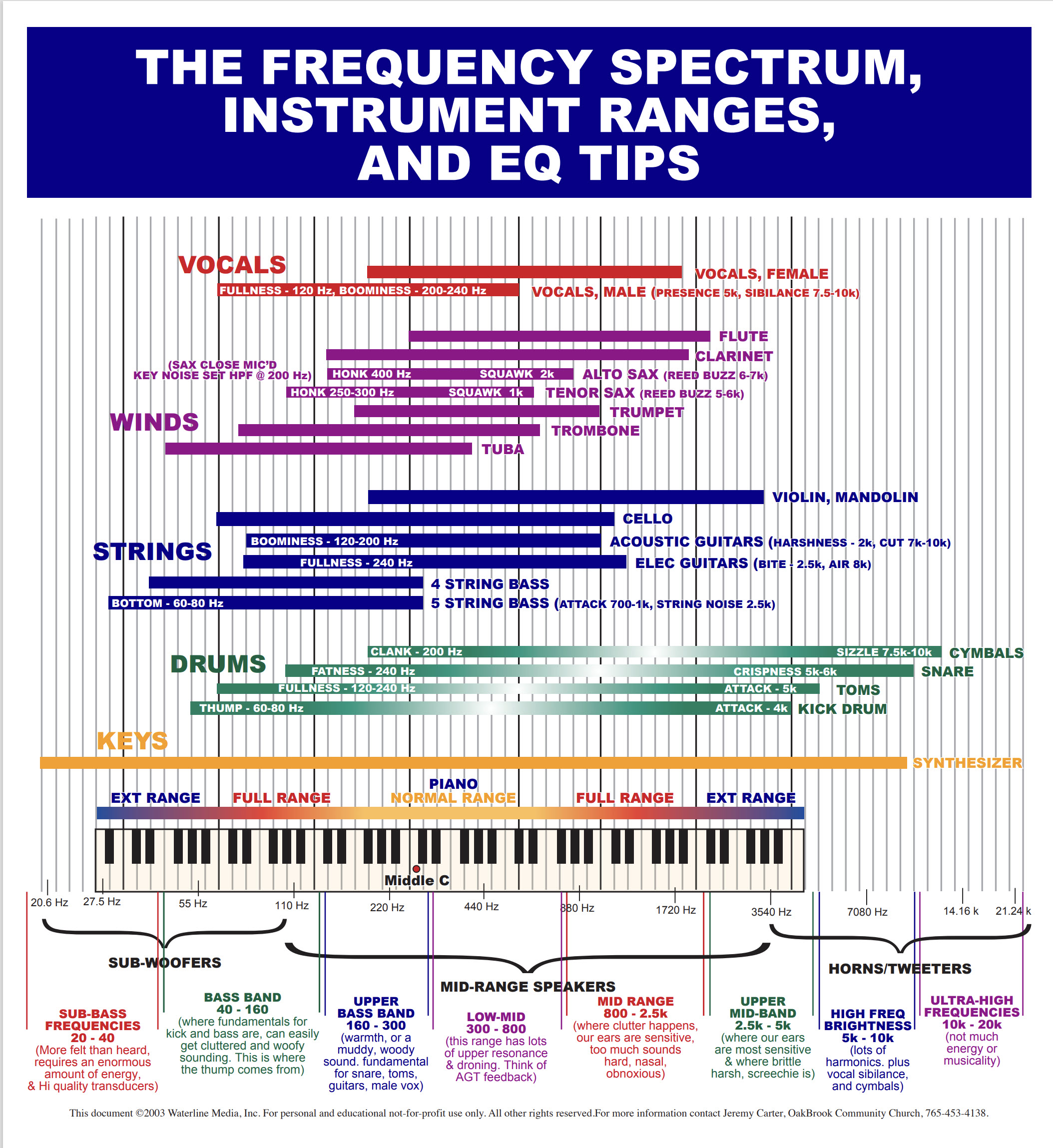 Most of what we hear in the human vocal range and instruments is below 2000 Hz. See the colored chart below for more details.