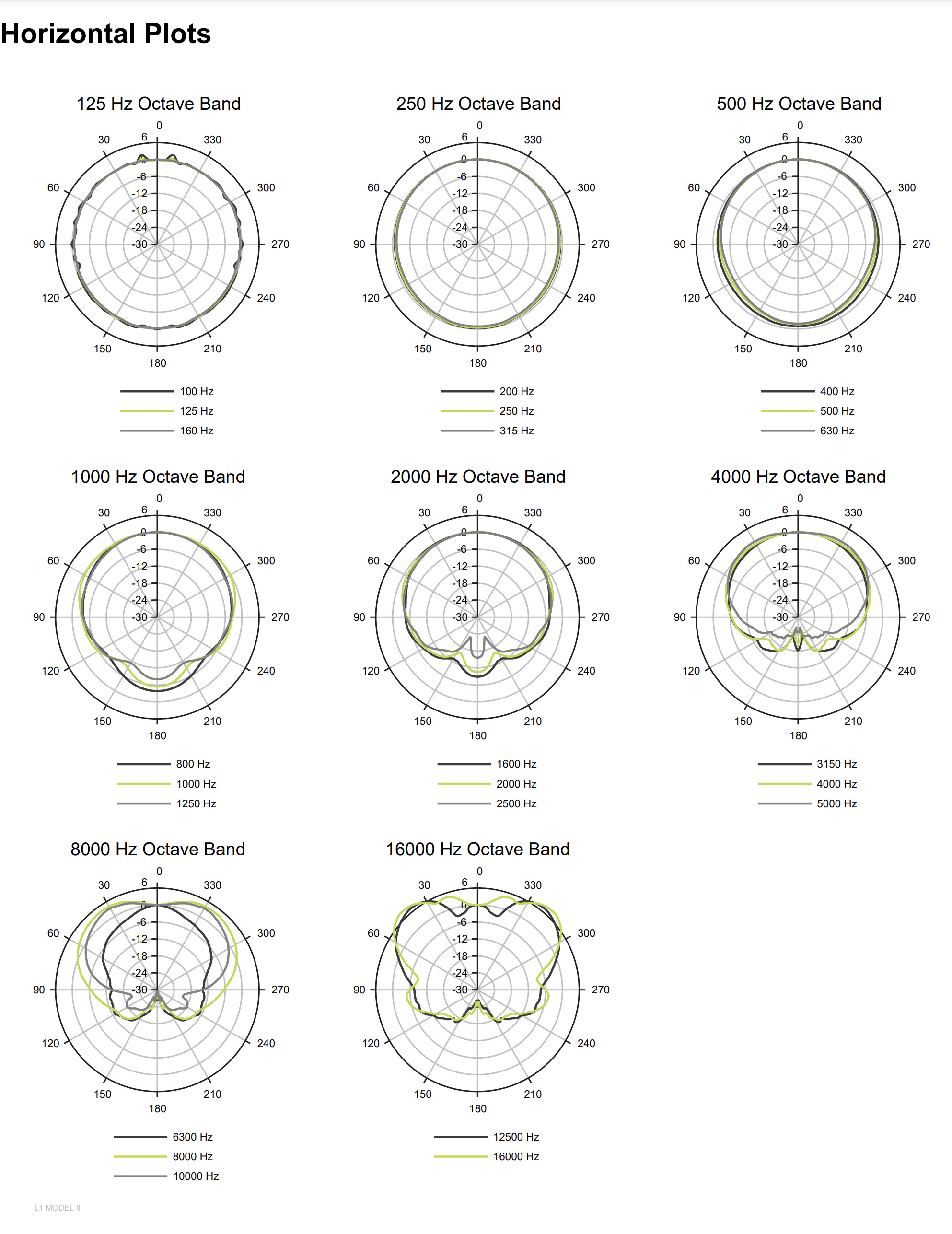 Up to about 1000 Hz, the L1s are almost omnidirectional. They become increasingly directional, with more sound in the 180-degree range facing forward as the frequencies rise beyond 1000 Hz.