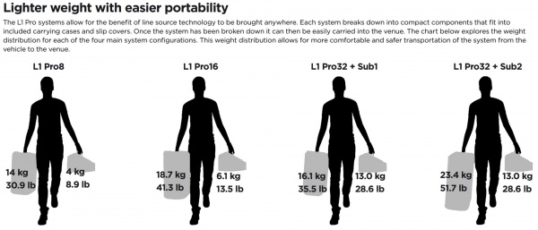 The L1 Pro32 with Sub1 is only 10 inches (22.8 cm) wider than the L1 Pro16 and 11.5 inches (29.2 cm) wider than the L1 Pro8. There are very few situations where that difference would matter on a live stage.