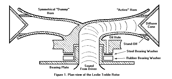 The Leslie’s high-frequency unit is largely responsible for the "Leslie Sound". Some organists actually find that the bass rotor’s slower response to speed changes is distracting, and will actually disconnect the bass rotor drive - especially when playing a bass line. The treble unit consists of a stationary 3/4-inch throat Jensen compression driver, connected to a vertical tube that acts as a thrust bearing (Figure 1). A twin-bell, molded black bakelite horn, which starts vertically but flares horizontally, sits on this bearing/tube, and rotates via a two-speed A.C. induction motor fitted with three (selectable) drive pulleys. This motor drives the treble horn at fast or slow speeds via drive belt and belt tension spring. Direct current is sometimes applied to the "fast" motor so that it will slow down more quickly; this is called a "D.C. brake". The treble horn actually looks like two horn assemblies; in fact, only one is operable as a horn. The other side, a "dummy", acts as a counterweight or dynamic balancer, providing symmetric air drag at high speed. The resulting structure rotates smoothly and without eccentric "wobble" forces.