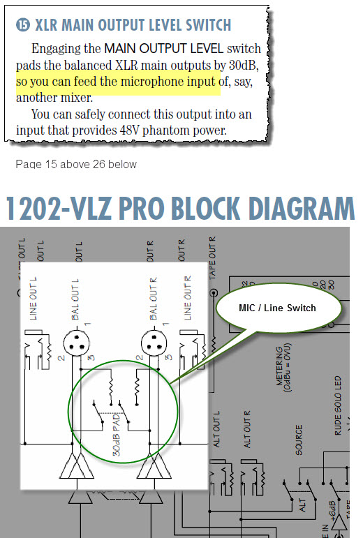 Details of the MIC/Line Switch from pages 15 and 26 of the Mackie 1202-VLZ Pro Manual