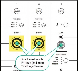The L1 Pro line-level inputs are the 1/4-inch (6.3 mm) Tip-Ring-Sleeve jacks on channels 1, 2, 3.