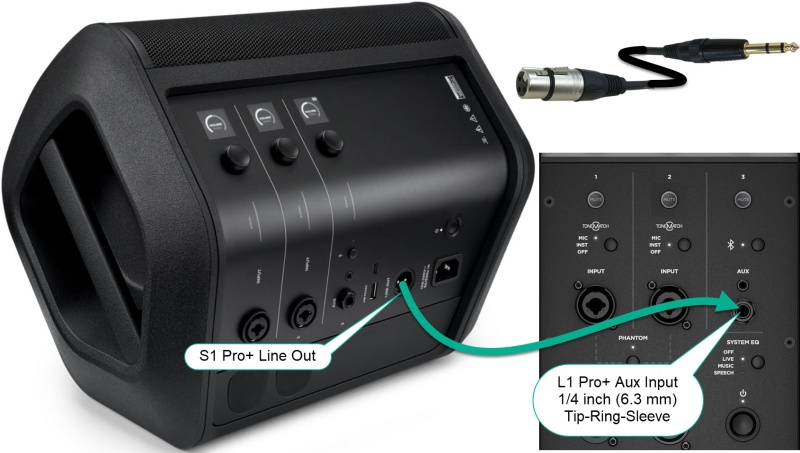 Use an XLR cable (e.g., microphone cable) to connect the S1 Pro+ Line Out to L1 Pro channel 1 or 2.