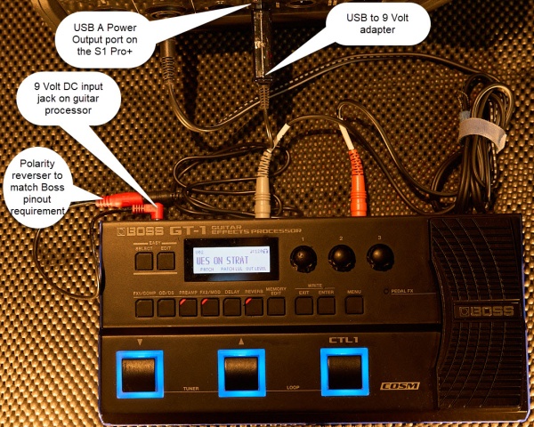 The BOSS GT-1 Guitar Effects Processor shown below operates on batteries or an external power supply. In the picture below, we're using a USB A to 9-volt power adapter to connect the S1 Pro+ USB Power port to the Boss 9-volt input jack.