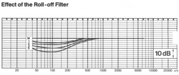 When a directional microphone is spoken into from a close distance, the lower frequencies are overemphasized. If this effect is not desired, it may be levelled by aid of a roll-off filter. From the diagram (Figure 5) showing the influence of the roll-off filter, it can be seen that in position M (music) the frequency response curve is not altered in any way. In position S (speech) however, the frequencies below 700 Hz are attenuated by up to 14 dB. Between the positions M and S the low frequency response can be altered in three defined steps.