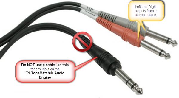 • Convert the signal to mono and if the output is balanced, use a 1/4 inch (6.3 mm) Tip-Ring-Sleeve or XLR to 1/4 inch (6.3 mm) Tip-Ring-Sleeve cable