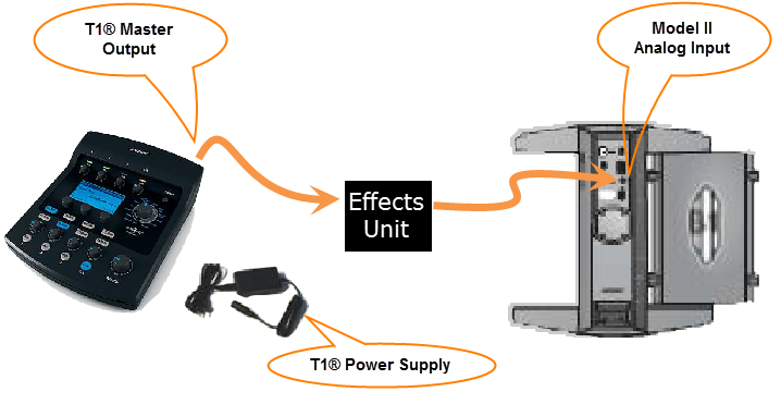 If you want to connect an effects unit between your T1 ToneMatch Audio Engine and Model II you will need a T1 ToneMatch® Audio Engine Power Supply because you will not be using the ToneMatch cable that would normally supply the power to the T1 ToneMatch Audio Engine.