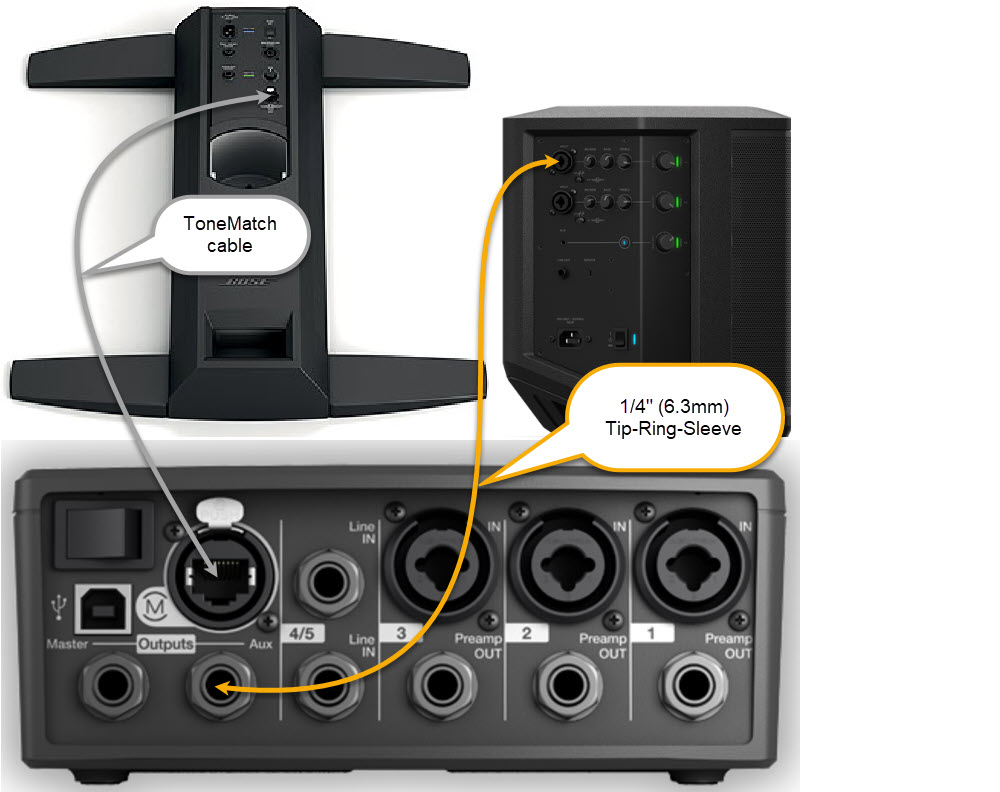 This article applies to connecting the T1 ToneMatch Audio Engine Master Output or Aux Output to the S1 Pro System