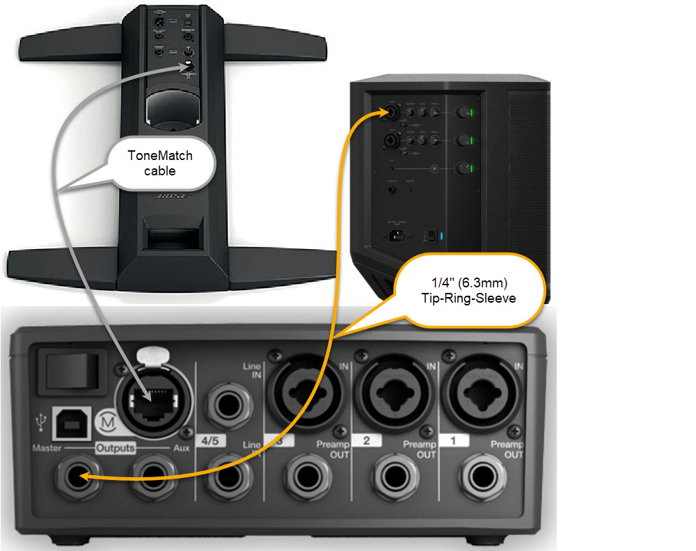 - The T1 ToneMatch Audio Engine Analog Outputs and the S1 Pro System 1/4 inch (6.3 mm) inputs are balanced. For best results use a 1/4 inch (6.3 mm) Tip-Ring-Sleeve cable for a balanced connection. You can use a 1/4 inch (6.35 mm) Tip-Sleeve cable, but you will lose up to -6 dB in signal strength and you may pick up line noise.
