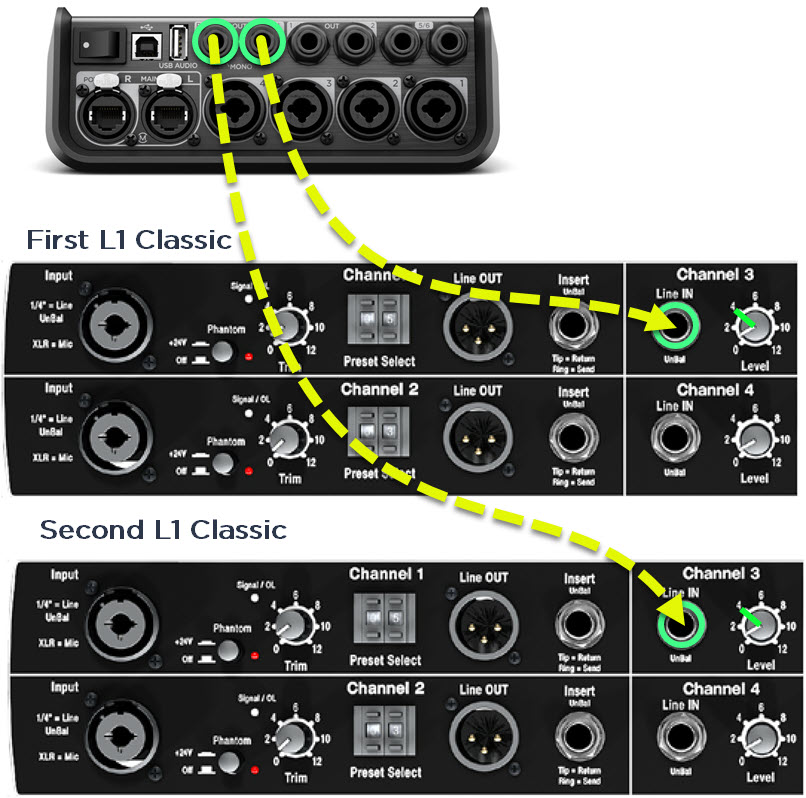 1. Pan all your inputs to one side (e.g. Right) and connect the T4S Right output to the L1® Classic Channel 3 (try setting the level to about 4)