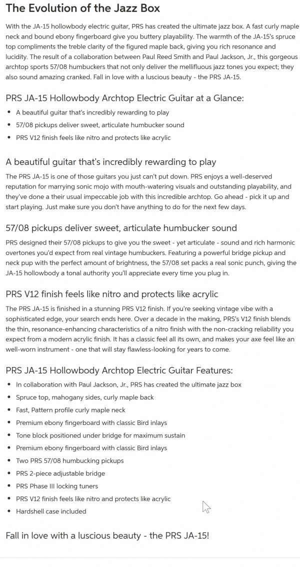 The result of a collaboration between Paul Reed Smith and Paul Jackson, Jr., the JA-15 was originally designed with jazz musicians in mind. But with several innovations, it's no surprise rockers are loving it too. Highlights include a "pattern" neck shape, 53/10 pickups, a 2-piece adjustable bridge, and V12 finish, all newly offered as standard appointments.